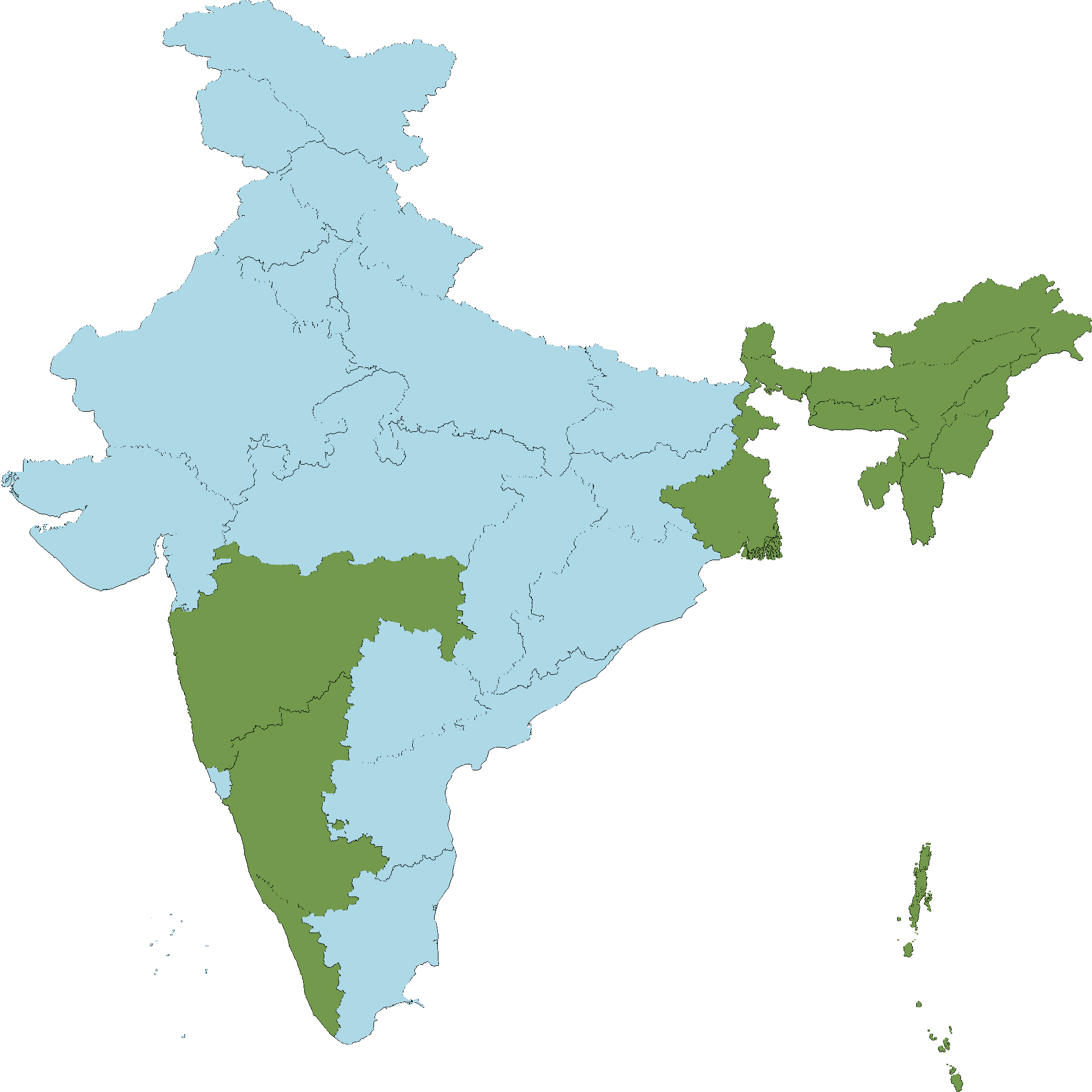 - Karnataka : Belagavi district, Hassan district, Kodagu (Coorg) district, Shivamogga district, Uttara Kannada district
