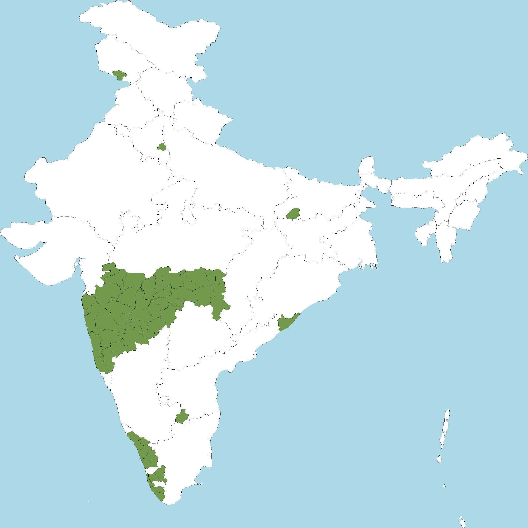 - Kerala : Kannur district, Wayanad district, Kozhikode district, Malappuram district, Palakkad district, Thrissur district, Idukki district, Kottayam district, Alappuzha district, Kollam district, Thiruvananthapuram district