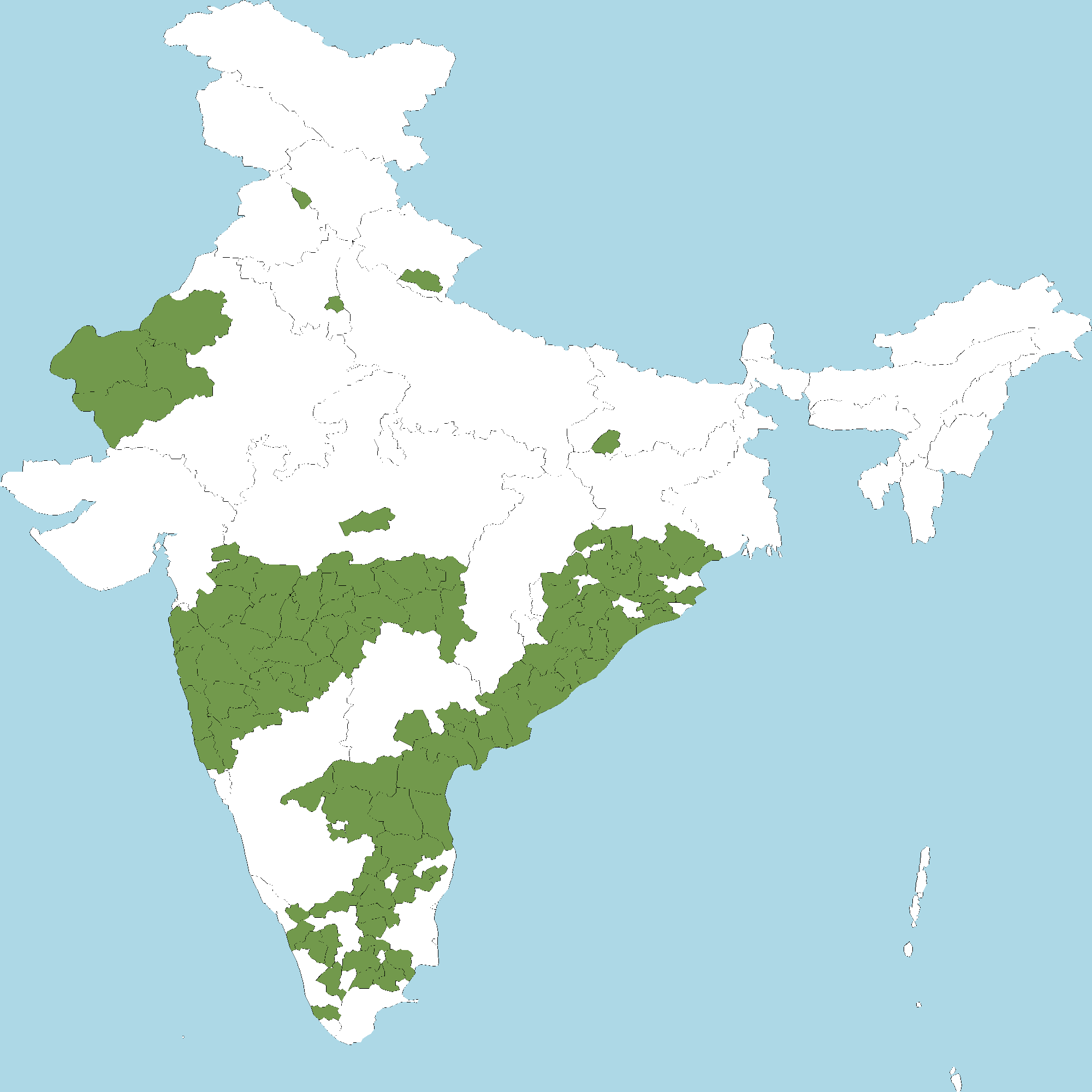- Andhra Pradesh : Anantapur district, Chittoor district, Y.S.R. Kadapa district, East Godavari district, Guntur district, Krishna district, Kurnool district, S.P.S. Nellore district, Prakasam district, Srikakulam district, Visakhapatnam district, Vizianagaram district, West Godavari district