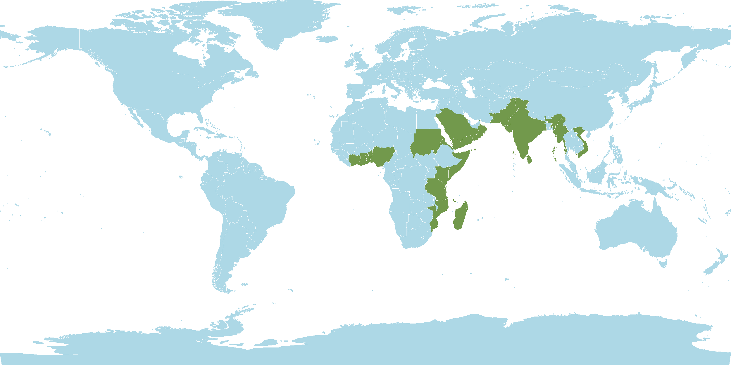- Native : Benin, Central African Repu, Comoros, Eritrea, Ghana, India, Ivory Coast, Jawa, Kenya, Madagascar, Mozambique, Myanmar, Nigeria, Oman, Pakistan, Saudi Arabia, Socotra, Somalia, Sri Lanka, Sudan, Tanzania, Togo, Vietnam, Yemen