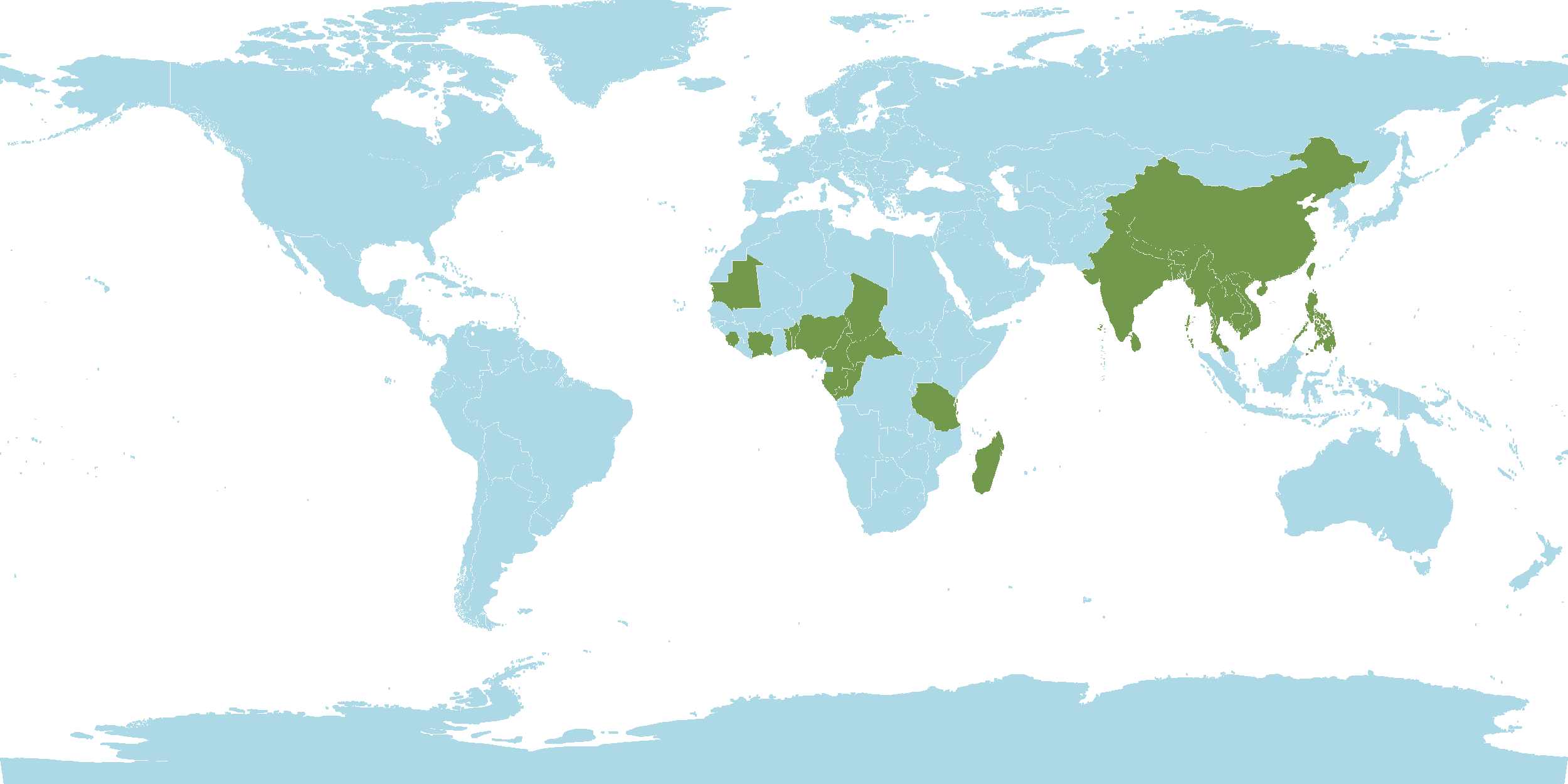 - World Distribution : Bangladesh, Benin, Bhutan, Borneo, Burkina, Cambodia, Cameroon, Central African Republic, Chad, China, Congo, Gabon, Gambia, Hainan, India, Ivory Coast, Jawa, Laos, Lesser Sunda Islands, Madagascar, Malaya, Maluku, Mauritania, Myanmar, Nepal, New Guinea, Nigeria, Philippines, Sierra Leone, South China Sea, Sri Lanka, Sulawesi, Sumatera, Taiwan, Tanzania, Thailand, Togo, Vietnam, Zaïre