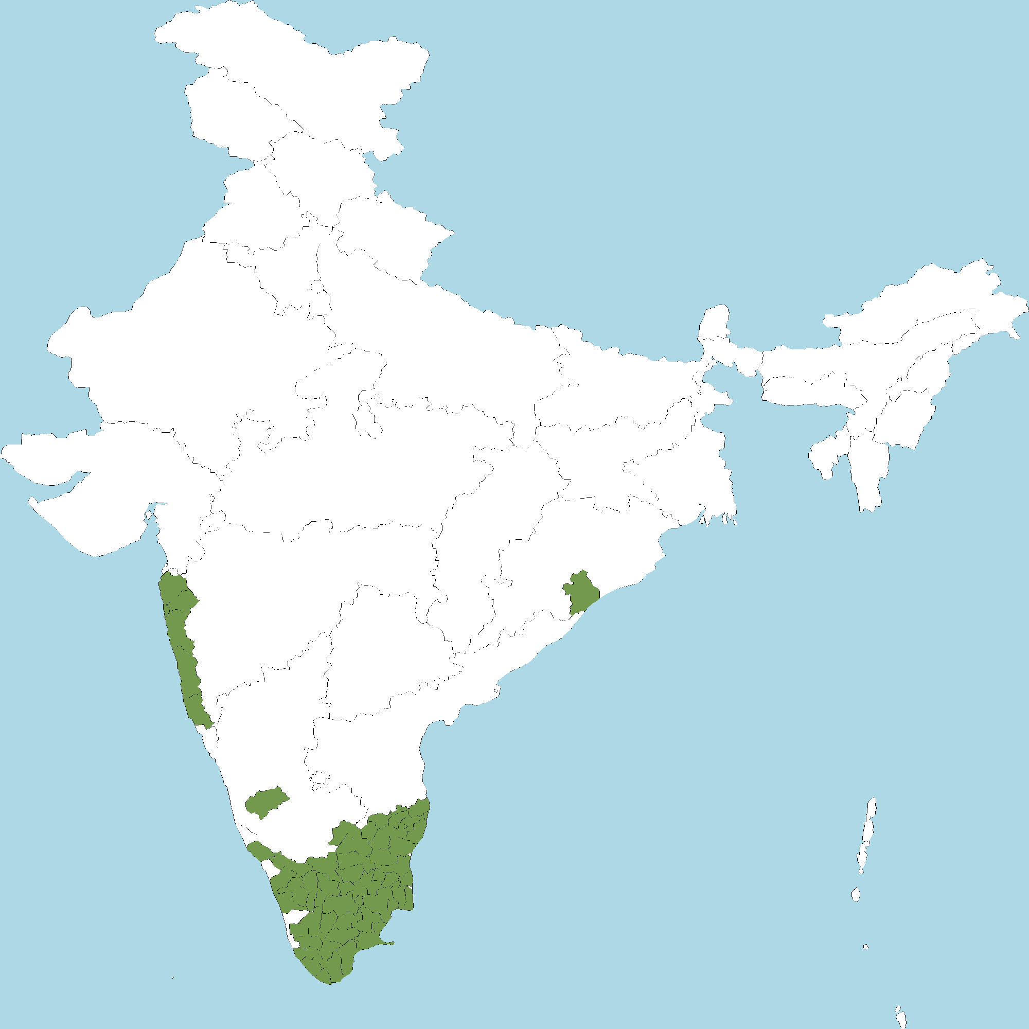 - Kerala : Wayanad district, Malappuram district, Palakkad district, Thrissur district, Idukki district, Kottayam district, Pathanamthitta district, Kollam district, Thiruvananthapuram district, Kannur district