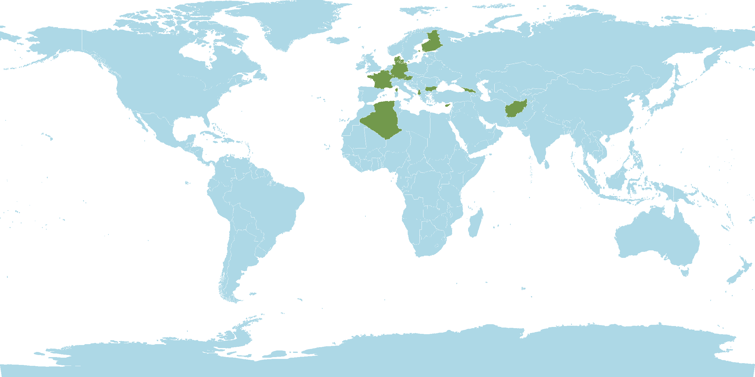 - Native : Afghanistan, Albania, Algeria, Altay, Austria, Baleares, Baltic States, Belgium, Bulgaria, Canary Is., Cape Provinces, Central European Rus, Corse, Cyprus, Czechoslovakia, Denmark, East Aegean Is., East European Russia, Finland, France, Germany, Great Bri