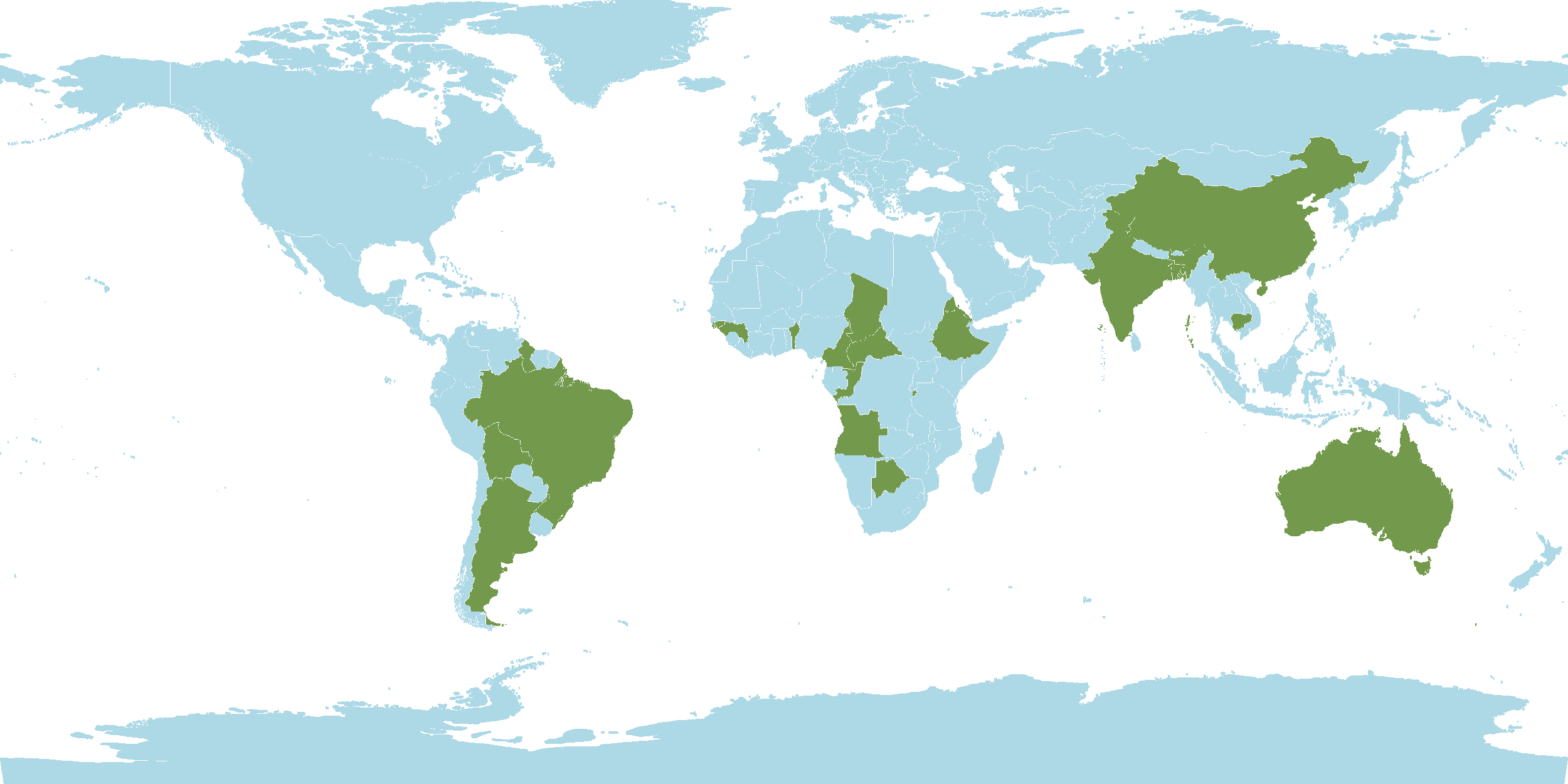 - Native : Angola, Argentina, Australia, Bangladesh, Benin, Bolivia, Botswana, Brazil, Burkina, Burundi, Cambodia, Cameroon, Caprivi Strip, Central African Republic, Chad, China, Congo, Eritrea, Ethiopia, Gambia, Guinea, Guinea-Bissau, Guyana, Hainan, India, Ivory C