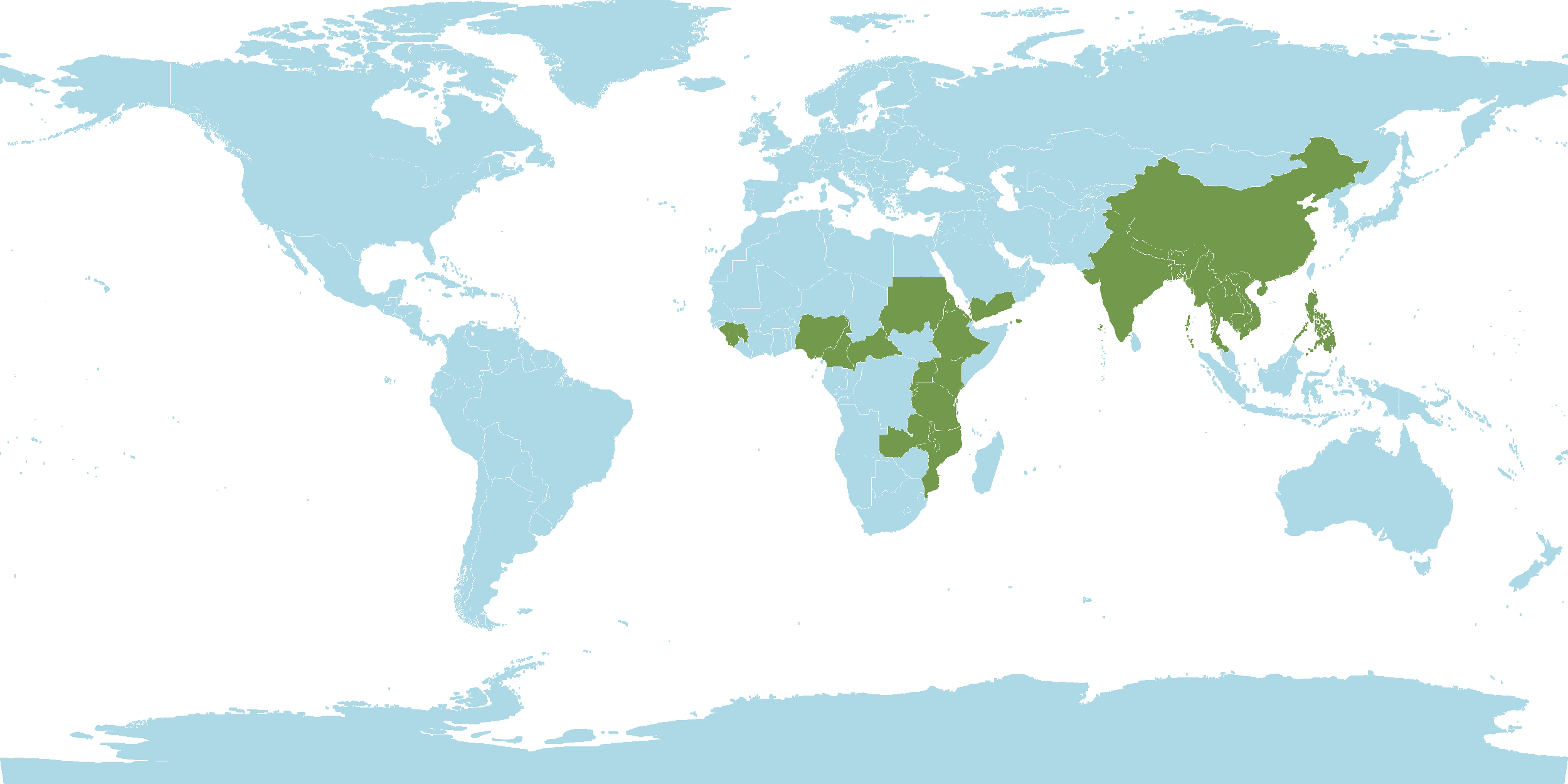 - World Distribution : Bangladesh, Bhutan, Burundi, Cambodia, Cameroon, Central African Republic, China, Eritrea, Ethiopia, Guinea, India, Jawa, Kenya, Laos, Lesser Sunda Islands, Malawi, Mozambique, Myanmar, Nepal, New Guinea, Nigeria, Philippines, Rwanda, Sierra Leone, Sudan, Sumatera, Tanzania, Thailand, Uganda, Vietnam, Yemen, Zambia, Zaïre