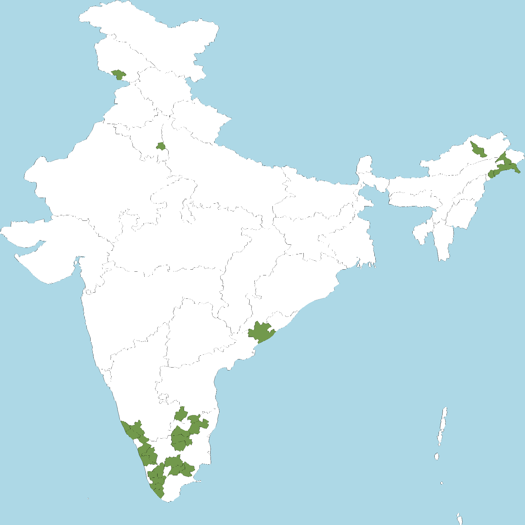 - Kerala : Kannur district, Kasaragod district, Wayanad district, Malappuram district, Palakkad district, Thrissur district, Idukki district, Kottayam district, Pathanamthitta district, Kollam district, Thiruvananthapuram district