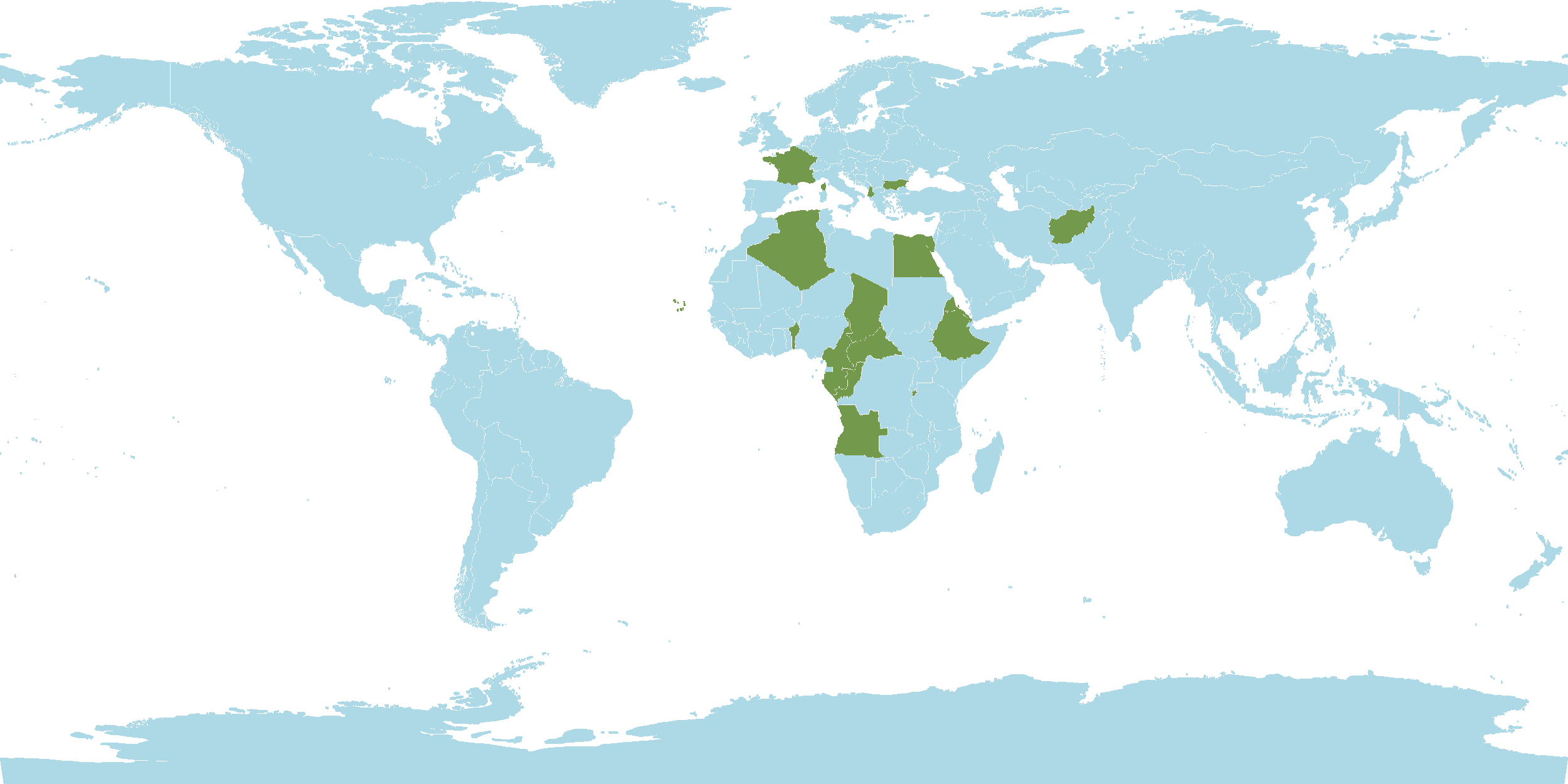 - Native : Afghanistan, Albania, Aldabra, Algeria, Angola, Ascension, Azores, Baleares, Benin, Bulgaria, Burkina, Burundi, Cameroon, Canary Islands, Cape Verde, Central African Republic, Chad, Chagos Archipelago, Congo, Corse, Egypt, Eritrea, Ethiopia, France, Gabon