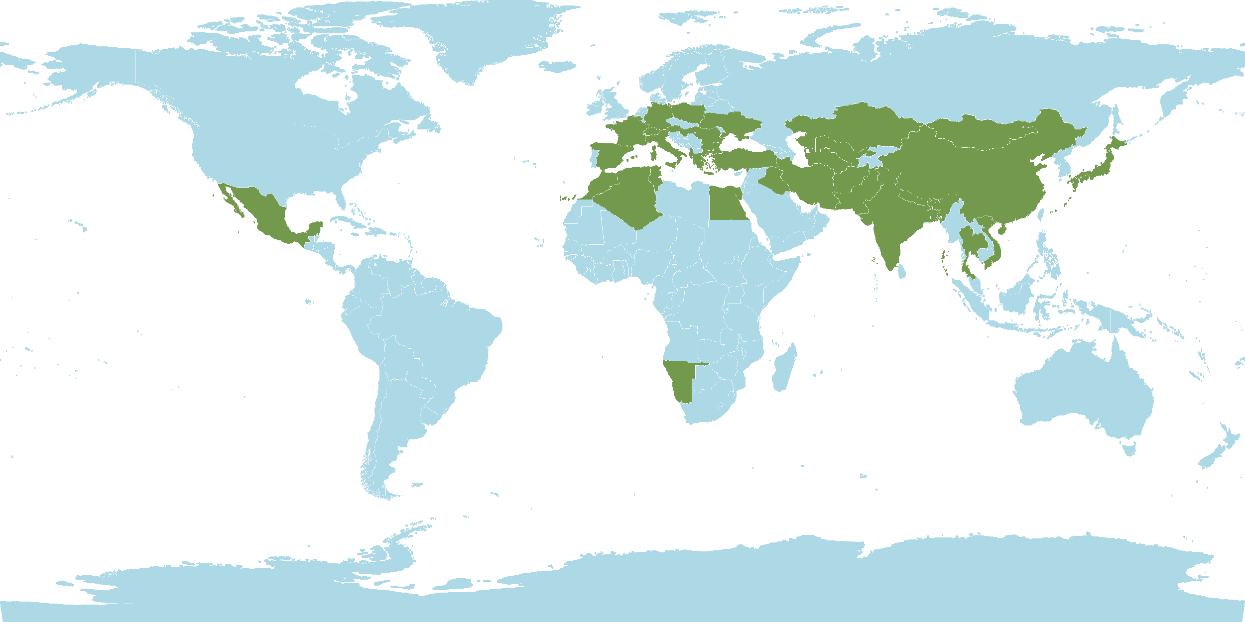 - World Distribution : Afghanistan, Albania, Alberta, Algeria, Altay, Amur, Austria, Bangladesh, Belgium, Bhutan, British Columbia, Bulgaria, Cape Provinces, Central European Russia, China, Colorado, Czechoslovakia, East European Russia, Egypt, France, Free State, Germany, Greece, Hungary, Idaho, Illinois, India, Inner Mongolia, Iowa, Iran, Iraq, Italy, Japan, Kansas, Kazakhstan, Khabarovsk, Kirgizstan, Korea, Krym, KwaZulu-Natal, Lebanon-Syria, Louisiana, Magadan, Manchuria, Manitoba, Mexico, Michigan, Minnesota, Missouri, Mongolia, Montana, Morocco, Namibia, Nebraska, Nepal, New Mexico, New York, North Caucasus, North Dakota, Northern Provinces, Northwest Territories, Ohio, Oklahoma, Ontario, Oregon, Pakistan, Palestine, Pennsylvania, Poland, Primorye, Romania, Saskatchewan, Sinai, South Dakota, South European Russia, Spain, Switzerland, Tadzhikistan, Texas, Thailand, Tibet, Transcaucasus, Tunisia, Turkey, Turkey-in-Europe, Turkmenistan, Ukraine, Utah, Uzbekistan, Vietnam, Washington, West Siberia, Wyoming, Xinjiang, Yakutskiya, Yugoslavia