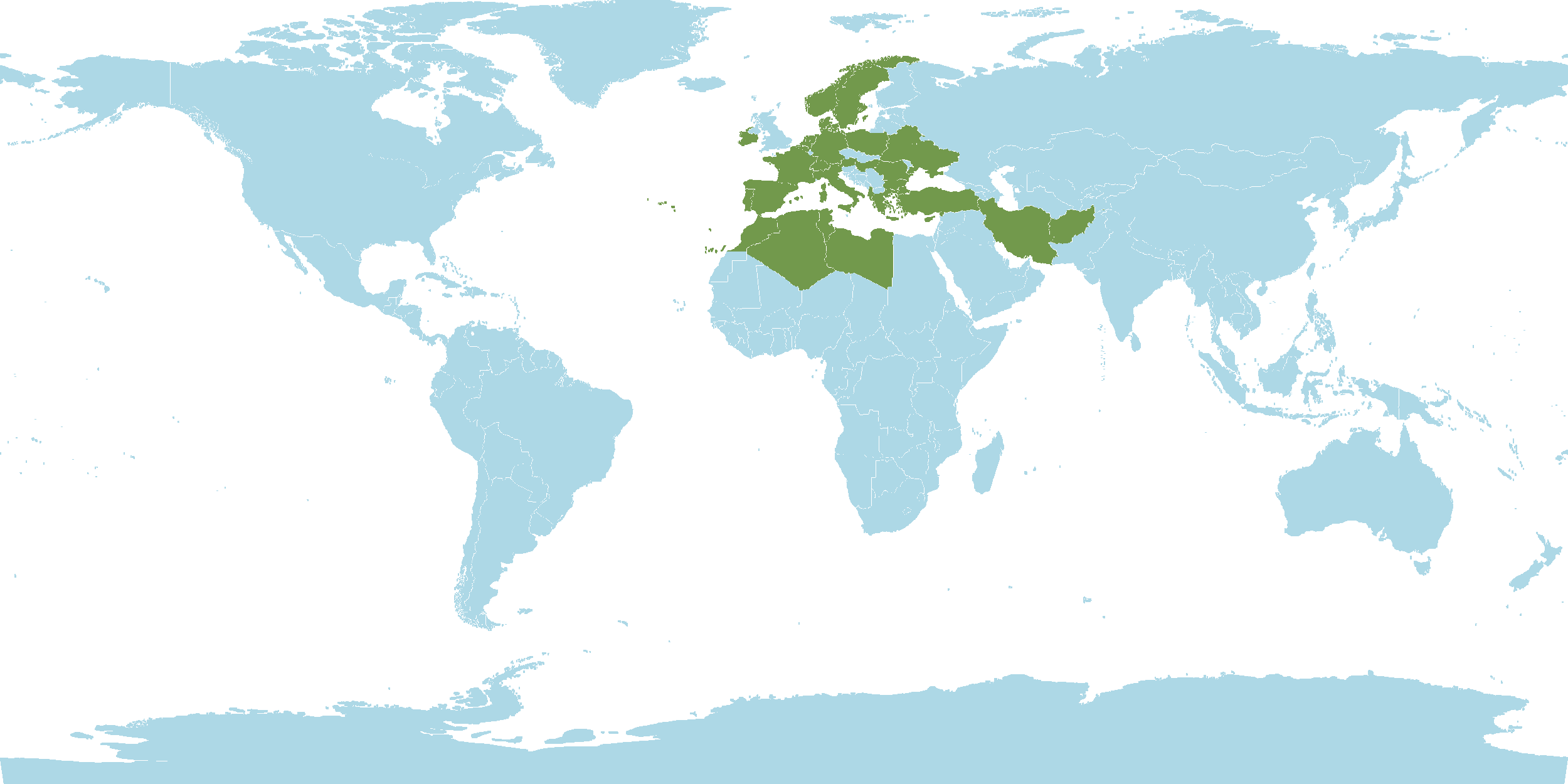 - World Distribution : Afghanistan, Albania, Algeria, Austria, Belarus, Belgium, Bulgaria, Corse, Cyprus, Czechoslovakia, Denmark, France, Germany, Great Britain, Greece, Hungary, Iran, Ireland, Italy, Krym, Libya, Morocco, Netherlands, North Caucasus, Norway, Poland, Portugal, Romania, Sardegna, Sicilia, Spain, Sweden, Switzerland, Transcaucasus, Tunisia, Turkey, Turkey-in-Europe, Ukraine, Yugoslavia