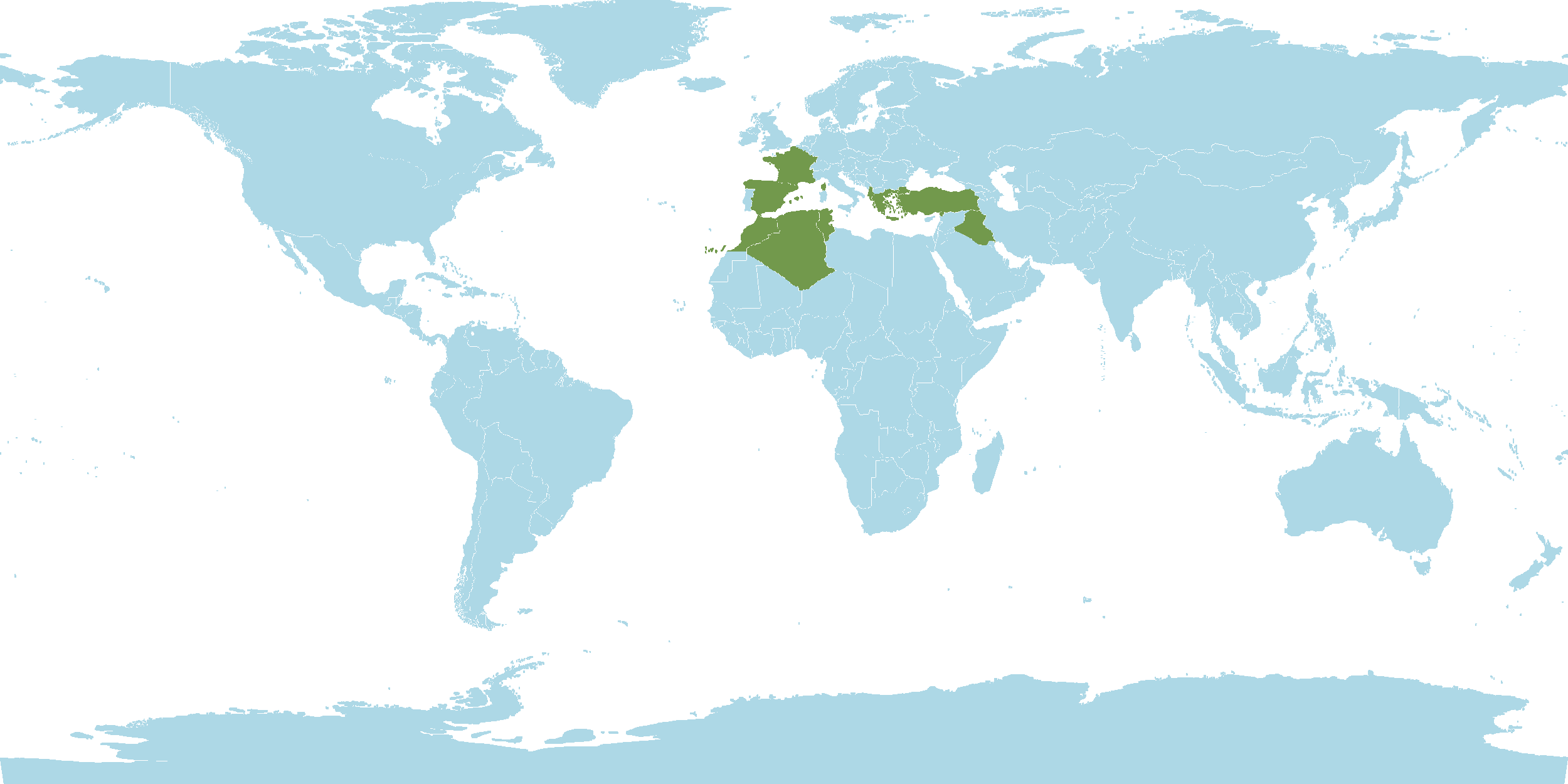 - World Distribution : Albania, Algeria, Corse, East Aegean Islands, France, Greece, Iraq, Kriti, Lebanon-Syria, Morocco, Sardegna, Spain, Tunisia, Turkey, Yugoslavia