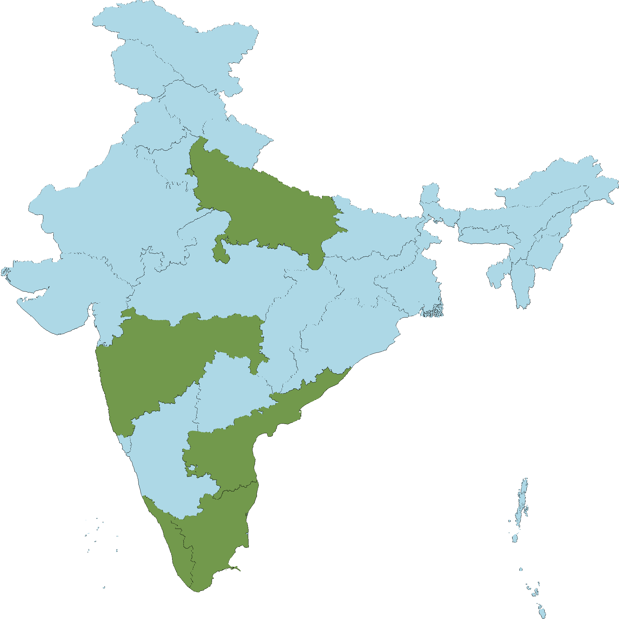 • Tamil Nadu : Coimbatore district, Cuddalore district, Kancheepuram (Changalpattu-CGP) district, The Nilgiri district, Pudukkottai district, Thiruvallur district, Tiruchirapalli district, Tirunelveli district, Tiruvannamalai district, Vellore district, Villipuram district