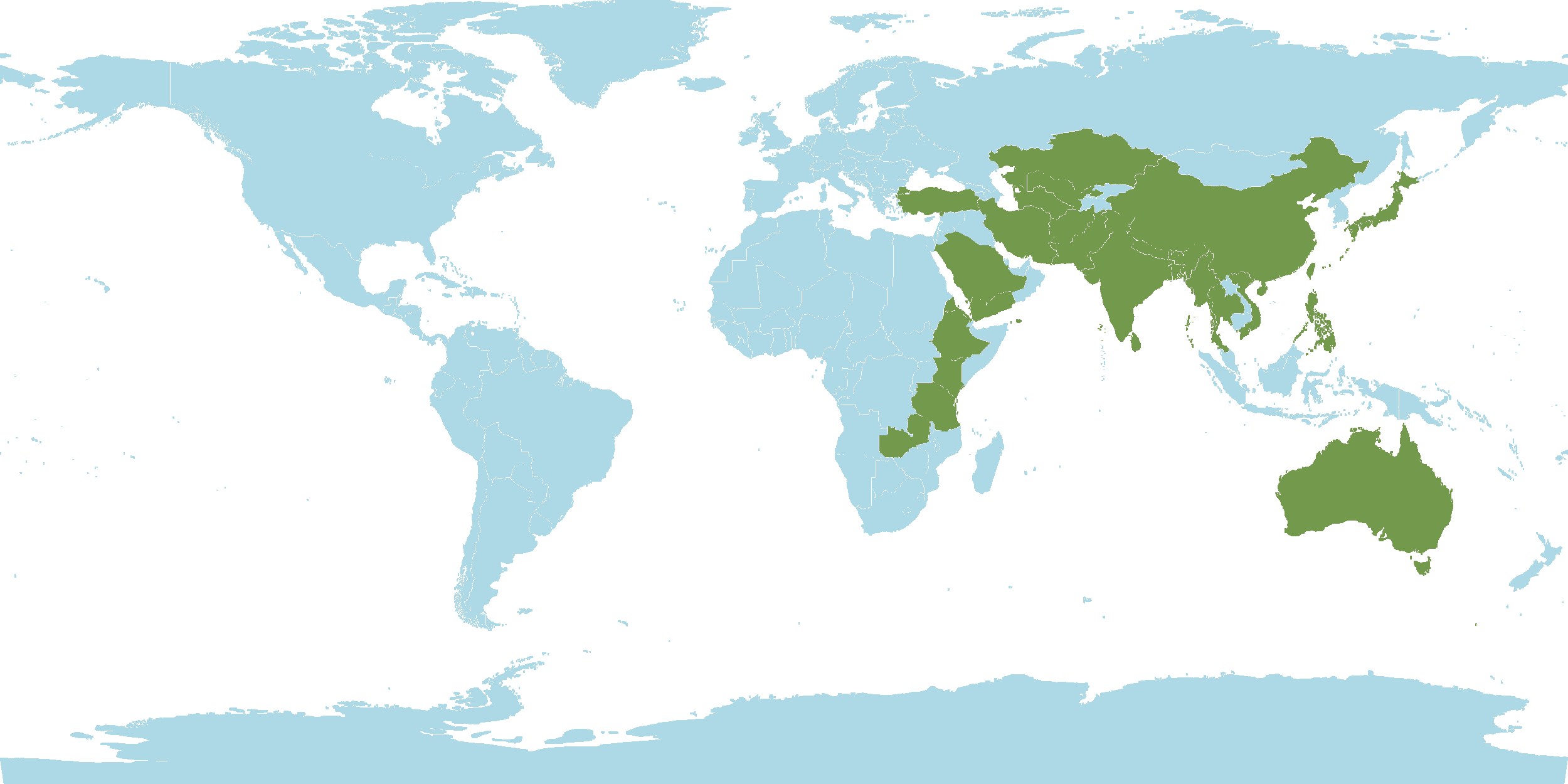 - World Distribution : Afghanistan, Amur, Andaman and Nicobar Islands, Australia, Bangladesh, Bhutan, Borneo, China, Eritrea, Ethiopia, Hainan, India, Inner Mongolia, Iran, Japan, Jawa, Kazakhstan, Kazan-retto, Kenya, Kirgizstan, Korea, Lesser Sunda Islands, Malaya, Maluku, Manchuria, Myanmar, Nansei-shoto, Nepal, New Guinea, Ogasawara-shoto, Pakistan, Philippines, Primorye, Qinghai, Saudi Arabia, Sri Lanka, Sulawesi, Sumatera, Tadzhikistan, Taiwan, Tanzania, Tasmania, Thailand, Tibet, Transcaucasus, Turkey, Turkmenistan, Uzbekistan, Vietnam, Xinjiang, Yemen, Zambia