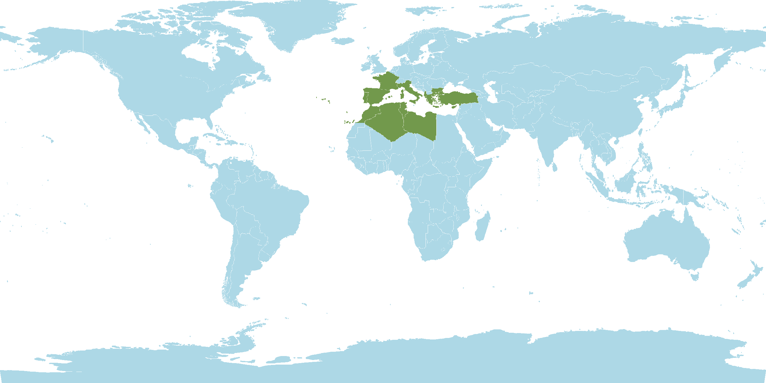 - World Distribution : Albania, Algeria, Baleares, Bulgaria, Cyprus, East Aegean Islands, France, Greece, Italy, Kriti, Lebanon-Syria, Libya, Morocco, Palestine, Portugal, Sardegna, Sicilia, Spain, Tunisia, Turkey, Turkey-in-Europe, Yugoslavia