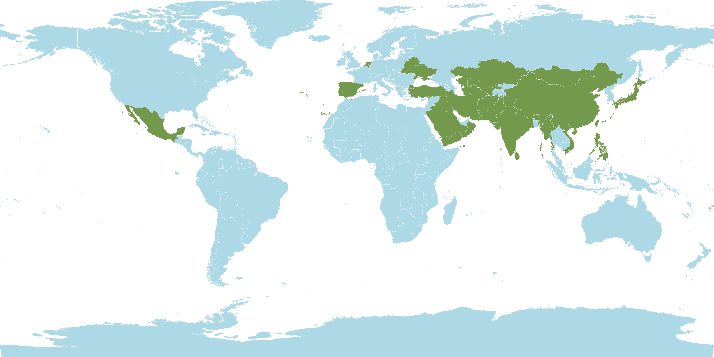 - World Distribution : Afghanistan, Alberta, Altay, Amur, Arizona, Baltic States, Belarus, Bhutan, Borneo, British Columbia, Buryatiya, California, Central European Russia, China, Chita, Colorado, East European Russia, Gulf States, Hainan, Idaho, Illinois, India, Inner Mongolia, Iowa, Iran, Iraq, Irkutsk, Japan, Jawa, Kansas, Kazakhstan, Khabarovsk, Kirgizstan, Krasnoyarsk, Krym, Kuwait, Lebanon-Syria, Magadan, Malaya, Manchuria, Manitoba, Mexico, Minnesota, Missouri, Mongolia, Montana, Myanmar, Nebraska, Nepal, Netherlands, Nevada, New Mexico, New York, North Caucasus, North Dakota, North European Russia, Northwest European Russia, Northwest Territories, Oklahoma, Oman, Ontario, Oregon, Pakistan, Palestine, Philippines, Portugal, Primorye, Qinghai, Saskatchewan, Saudi Arabia, South Dakota, South European Russia, Spain, Sri Lanka, Tadzhikistan, Taiwan, Texas, Tibet, Transcaucasus, Turkey, Turkmenistan, Tuva, Ukraine, Utah, Uzbekistan, Vermont, Vietnam, Washington, West Siberia, Wisconsin, Wyoming, Xinjiang, Yakutskiya, Yemen, Yukon