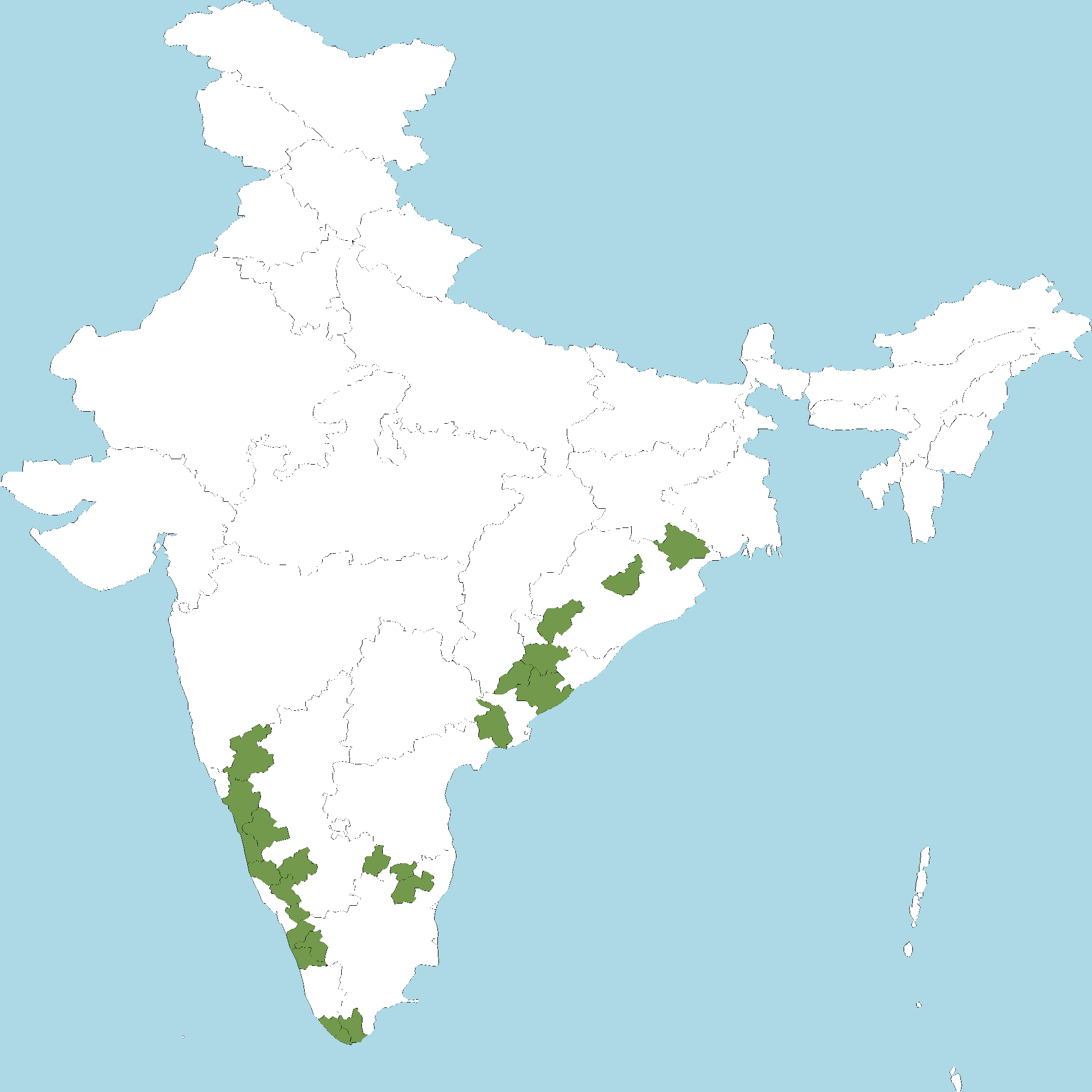 - Karnataka : Belagavi district, Hassan district, Kodagu (Coorg) district, Kolar district, Shivamogga district, Udupi district, Uttara Kannada district, Dakshina Kannada district, Kolar district