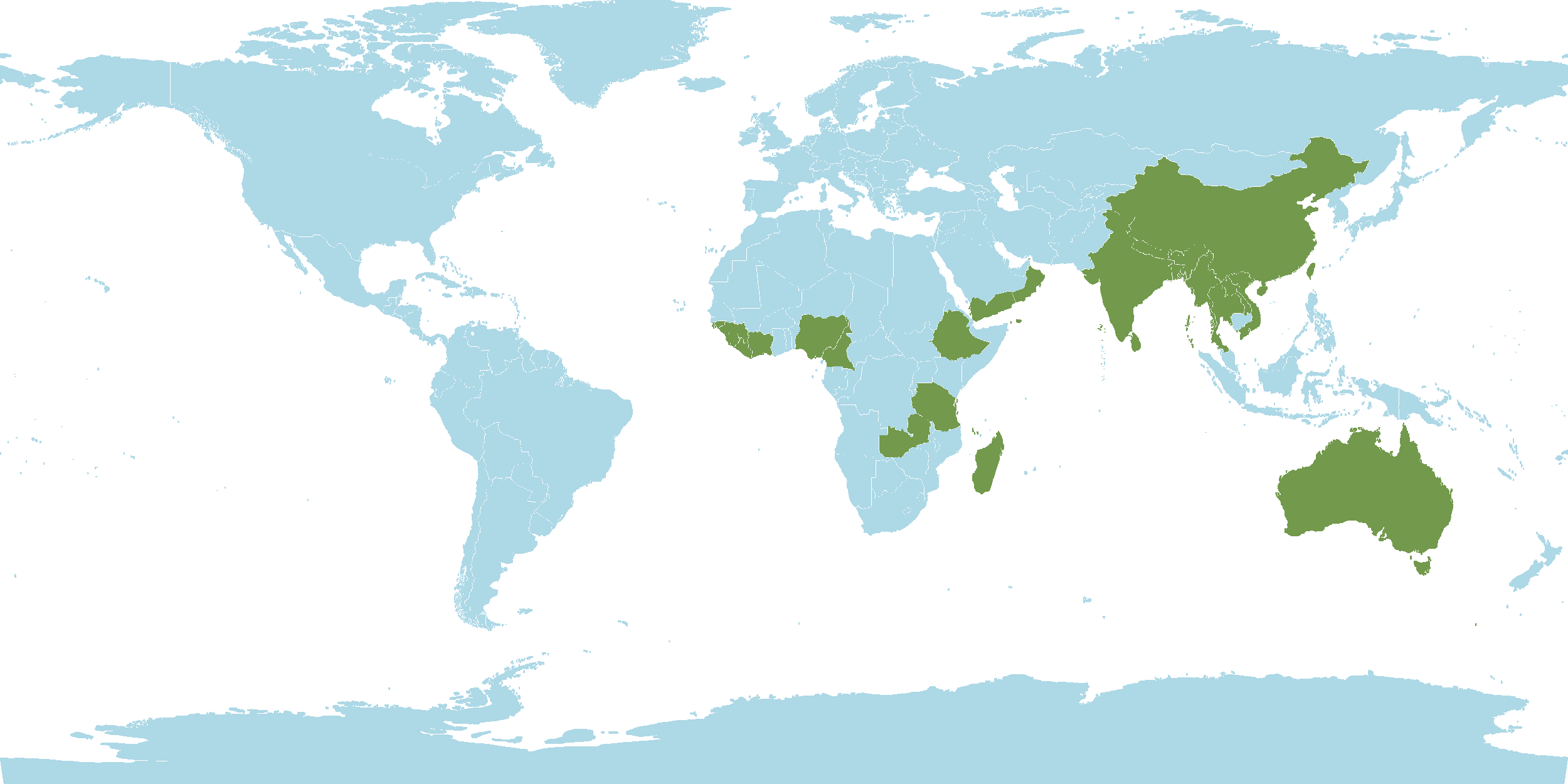 - Native : Australia, Bangladesh, Bhutan, Cameroon, Central African Repu, China, Christmas Island, Comoros, Ethiopia, Guinea, Guinea-Bissau, India, Ivory Coast, Jawa, Laos, Lesser Sunda Islands, Liberia, Madagascar, Myanmar, Nepal, Nigeria, Oman, Sierra Leone, Socot